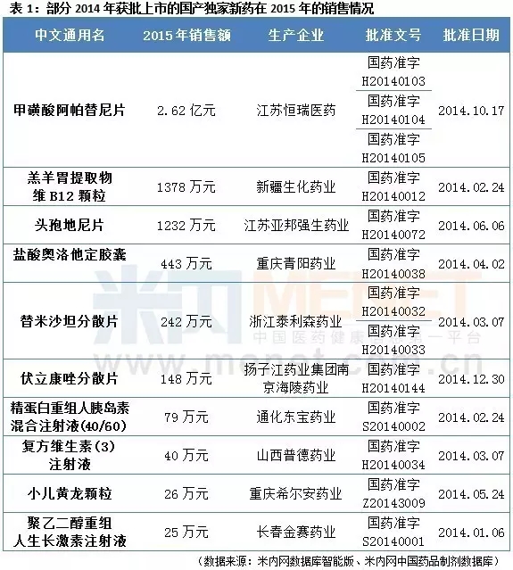 據(jù)米內(nèi)網(wǎng)數(shù)據(jù)顯示,2014年獲批上市的國產(chǎn)獨家新藥中,有1個產(chǎn)品在2015年銷售額過億元,2個產(chǎn)品突破千萬元,3個產(chǎn)品超過百萬元,上述6個暢銷產(chǎn)品全為化學(xué)藥。