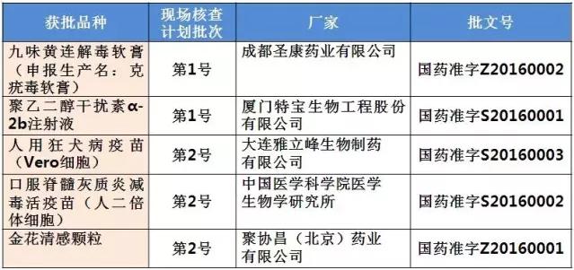 藥物臨床試驗(yàn)數(shù)據(jù)現(xiàn)場核查計(jì)劃公告(第2號(hào))中的第一批自查也有受理號(hào)同樣也是在2016年9月獲批,為大連雅立峰生物制藥有限公司的人用狂犬病疫苗(Vero細(xì)胞)(國藥準(zhǔn)字S20160003)、中國醫(yī)學(xué)科學(xué)院醫(yī)學(xué)生物學(xué)研究所的口服脊髓灰質(zhì)炎減毒活疫苗(人二倍體細(xì)胞)(國藥準(zhǔn)字S20160002)和聚協(xié)昌(北京)藥業(yè)有限公司的金花清感顆粒(國藥準(zhǔn)字Z20160001)。